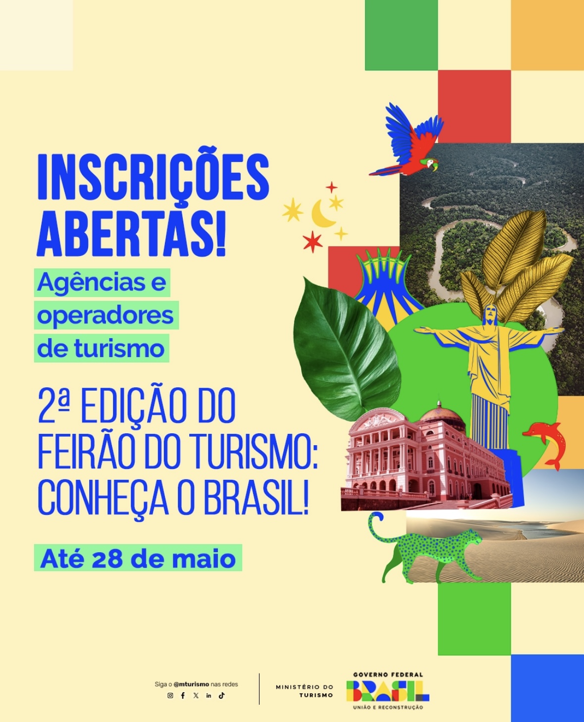 Estão abertas as inscrições para o Feirão do Turismo 2025, projeto inovador desenvolvido pelo Ministério do Turismo (MTur) que visa promover e apoiar a comercialização de produtos e destinos turísticos, fomentando o mercado doméstico em conformidade com as diretrizes do Plano Nacional do Turismo.