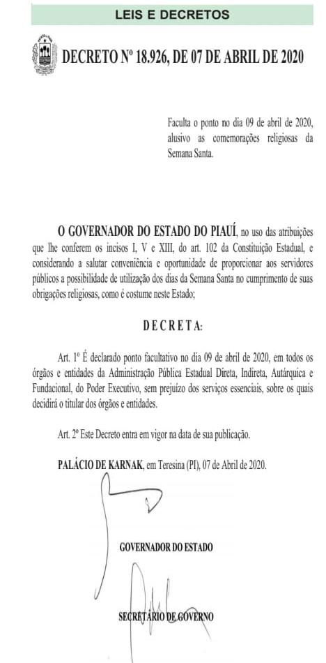 O Governo do Estado, considerando as comemorações religiosas alusivas à Semana Santa, decretou ponto facultativo nesta quinta-feira (9), a todos os órgãos da administração pública estadual direta, indireta, autárquica e fundacional.
