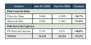 No litoral do Piauí, o Porto dos Tatus — principal porta de entrada para o Delta do Parnaíba, um dos três deltas em mar aberto do mundo — registrou 12.028 visitantes no bimestre, ante 9.494 no mesmo período de 2025, representando crescimento de 26,7%.